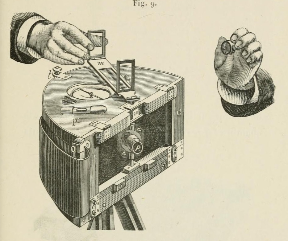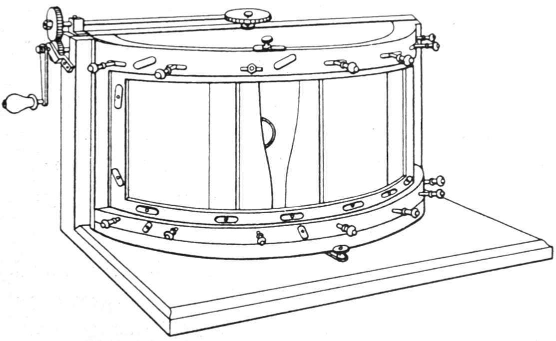 Martens modifiera son dispositif en 1856 afin de rendre l’utilisation de plaques planes au collodion possible. Il sera utilisé par Garella pour l’obtention d’images panoramiques rectilignes [10].