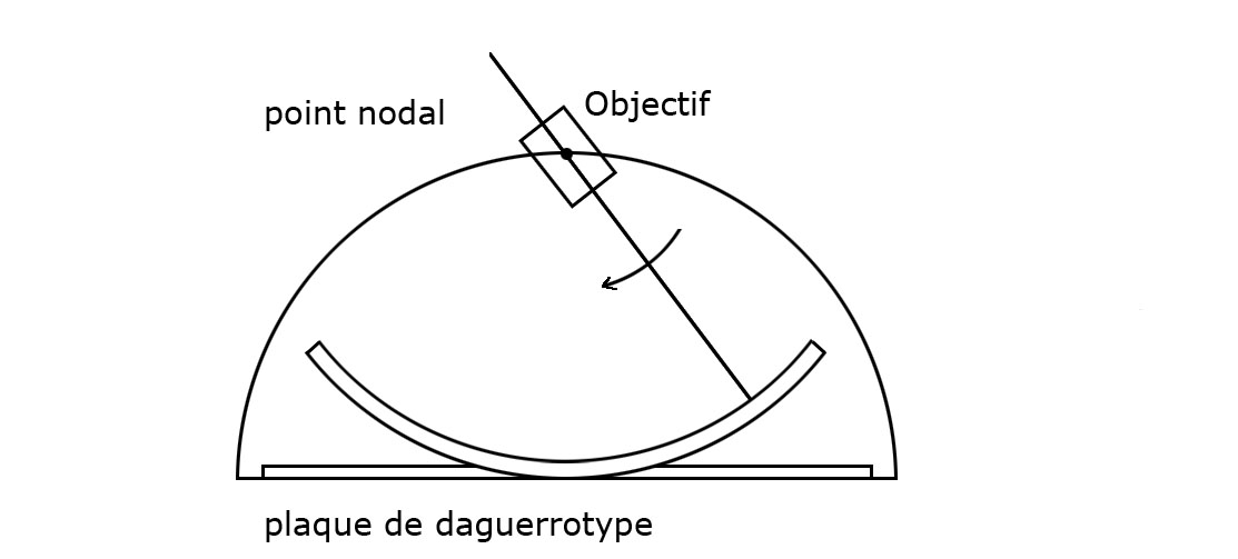 Le Mégascope (figure II-2) dont l’usage s’imposera sur celui de l’Ellipsen utilise une plaque cintrée (cylindrique, 38 cm de long pour 12 cm de large) et permet de prendre des vues de 150° avec un objectif, même médiocre, pivotant autour de son point nodal (swing lens, figure II-2b). Les daguerréotypes produits sont alors aplanis pour servir de matrice à l’encrage, révélant ainsi une perspective curviligne [9].