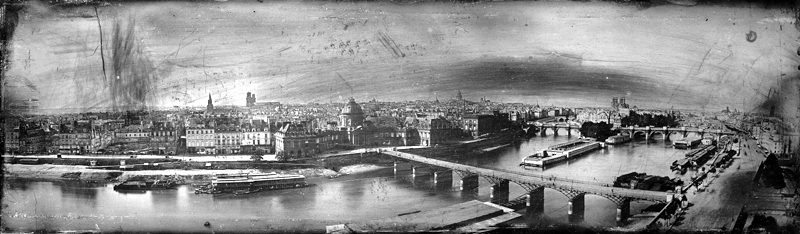 • qu’il est très proche, dans son geste plus que dans son résultat – dans sa saisie pourrait-on dire – du panorama pictural. Cette manière qui consiste à juxtaposer des vues successives pour produire un tour d’horizon va s’imposer naturellement aux premiers daguerrotypistes, comme elle s’était imposée pour la réalisation des relevés que nécessitaient les panoramas picturaux ; relevés dont on sait d’ailleurs qu’à l’inverse, il s’appuieront sur le daguerrotype, dès 1855 avec Langlois et ses repérages photographiques en Crimée, lors de la guerre éponyme, pour le panorama Le siège de Sébastopol.