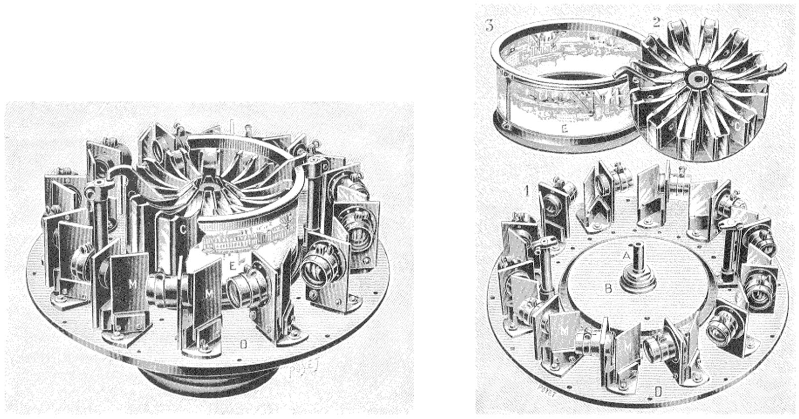 Cependant, ce sont les frères Lumière qui, avec leur Photorama, conçurent le premier dispositif ayant réussi à résoudre les difficultés propres à ce type de projection telles que le raccordement des images et la présence potentielle des spectateurs dans le champ [22]. Ce dispositif emprunte au cinématographe sa logique – le couple caméra/projecteur [23] – et bénéficie des progrès qu’il a amené en matière d’obturation. Il comprend donc un appareil de prise de vue – le périphote – et un projecteur au principe novateur – le photorama – qui donna son nom au dispositif (figure III-5) [24].