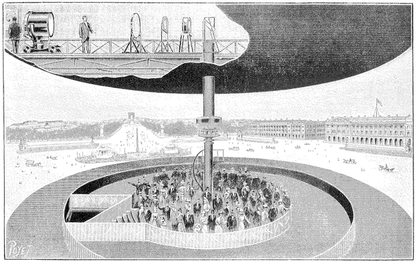 Malgré des dimensions honorables, les tirages panoramiques ne pouvaient pas rivaliser avec le gigantisme des panoramas picturaux. Seul un dispositif fonctionnant sur la projection [20] semblait capable de les concurrencer.