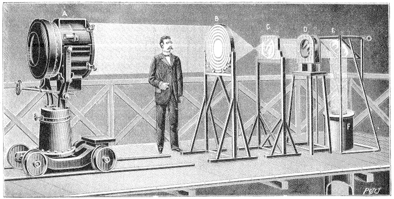 On doit le premier dispositif de projection panoramique à Manuel Perrier. Ironie de l’histoire, ce dispositif, conçu à l’origine pour faciliter l’exécution des panoramas picturaux, allait devenir l’instrument de leur disparition potentielle. En 1882, Perrier écrit : “Mon nouveau genre de panorama et de diorama a pour but et pour résultat de supprimer dans les panoramas et les dioramas la peinture des toiles de fond […] Ce qui n’a pas été fait, c’est de réunir et de raccorder une suite de projection simultanées pour en couvrir une vaste surface plane ou la surface cylindrique d’un grand panorama”. [21]
