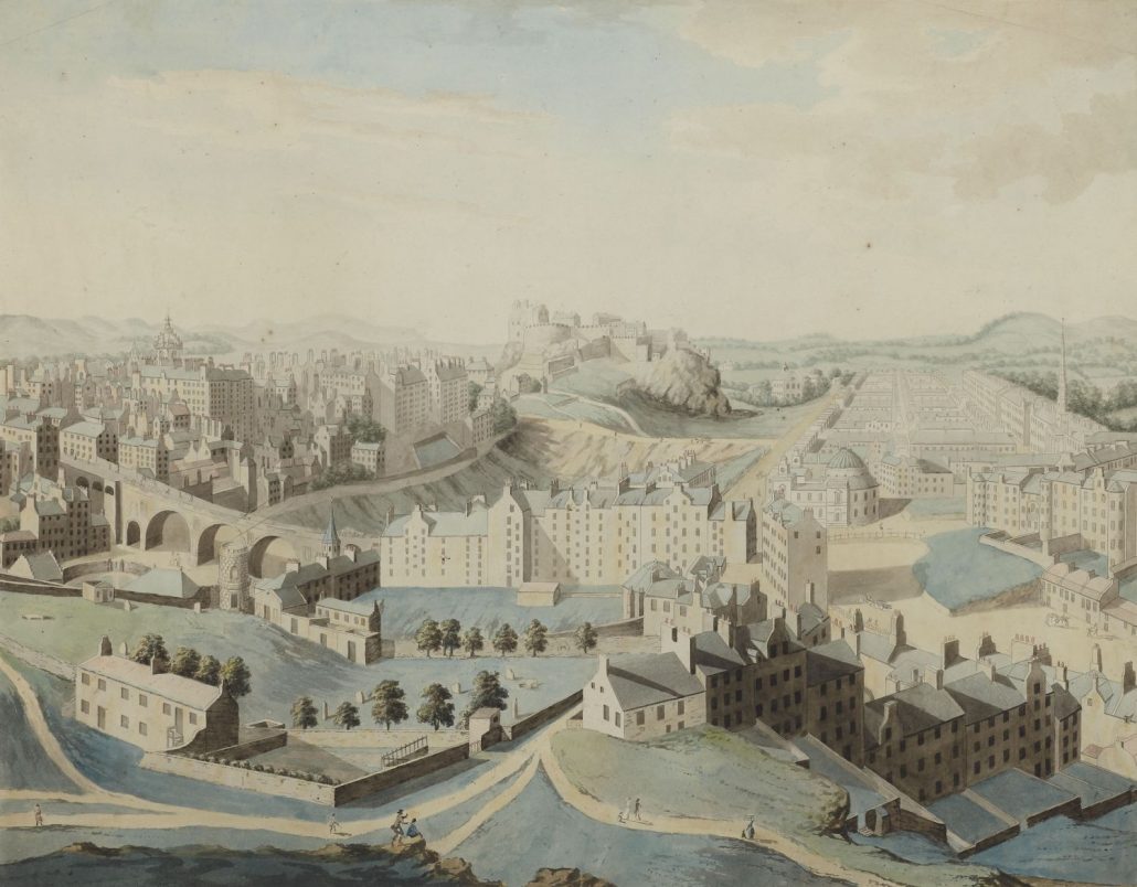 Le premier panorama, réalisé à l’aquarelle, n’a en fait pas été conservé. Seule subsiste une série de gravure comme celle-ci. La plupart des auteurs présente le second panorama d’Édimbourg (1789, en haut de page, peinture à l’huile) en lieu et place du panorama perdue de 1788.