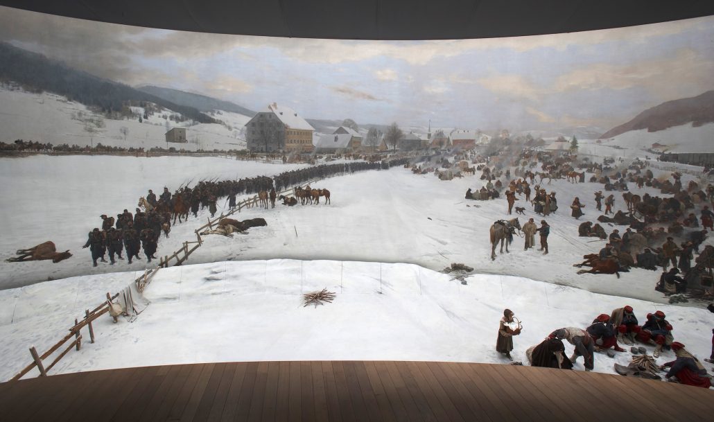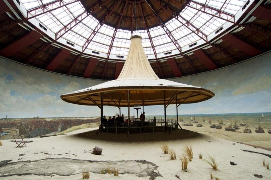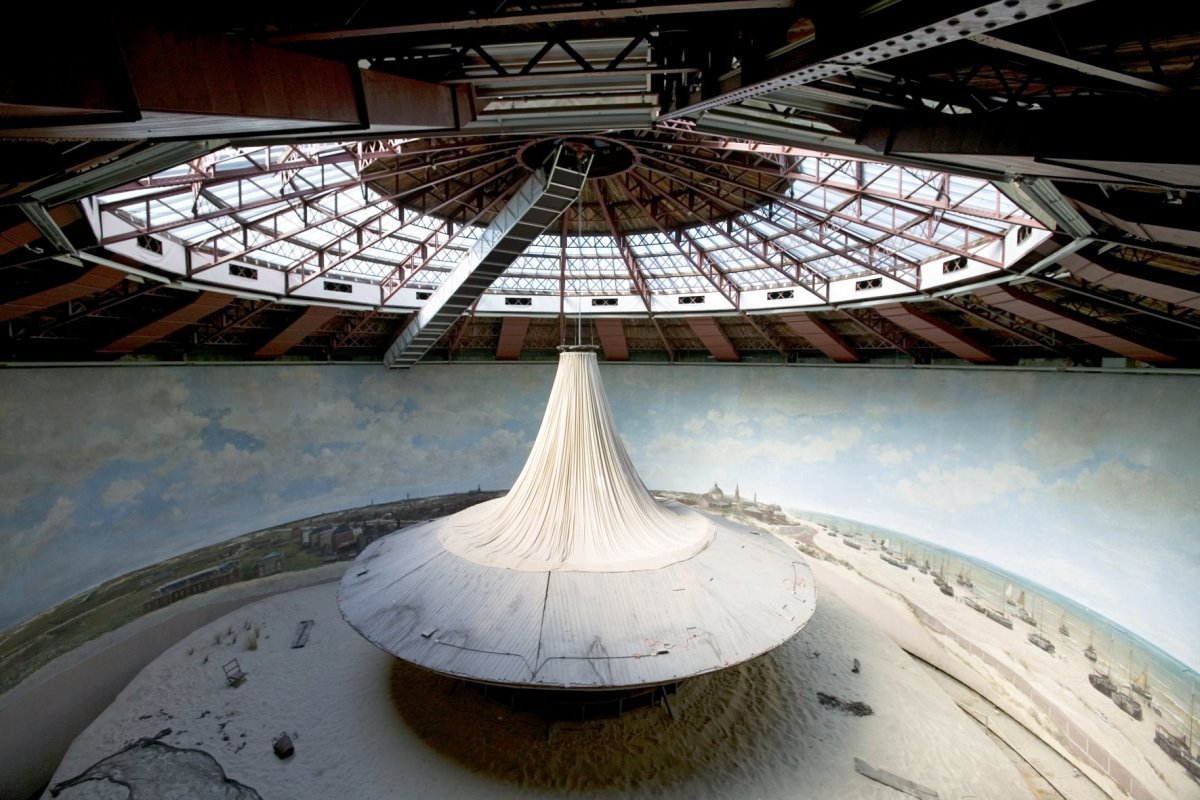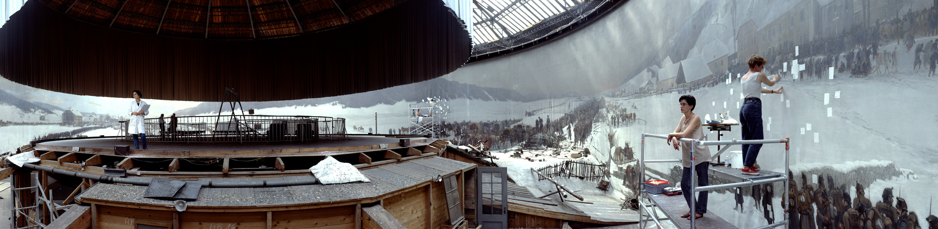 • Une plate-forme, placée au centre de la rotonde, sur laquelle les spectateurs peuvent librement circuler pour découvrir le tableau qui les entoure. Cette plate-forme constitue le point idéal de vision et est en concordance avec le point de construction de la peinture.