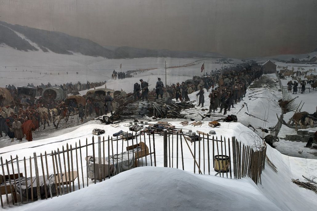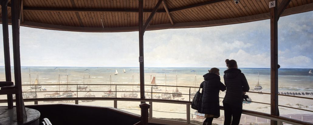 • L’éclairage de la peinture est réalisé par des ouvertures surplombant la toile de sorte que la lumière du jour vient éclairer le tableau par le haut. Patrick Desile dit de cet éclairage qu’il est, plus que naturel, nature [7]. Les panoramas présentaient ainsi une variabilité avec la lumière extérieure propre à les rendre vivants, à reproduire l’effet des changements de lumière en extérieur. Du fait de cet éclairage zénithal, le ciel est davantage éclairé que le sol du premier plan donnant ainsi “une apparence naturelle que n’obtiendrait pas une surface plane” [8]