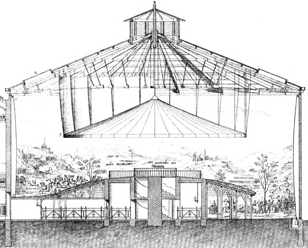 Contrairement à la plupart des auteurs, nous optons pour une rotonde bien plus tardive, plus à même de décrire le panorama dans ses principes. La rotonde de Leicester que Barker fit édifier à Londres en 1796, bien spécifique puisqu’elle présentait deux panoramas en même temps, est présentée à la section suivante.