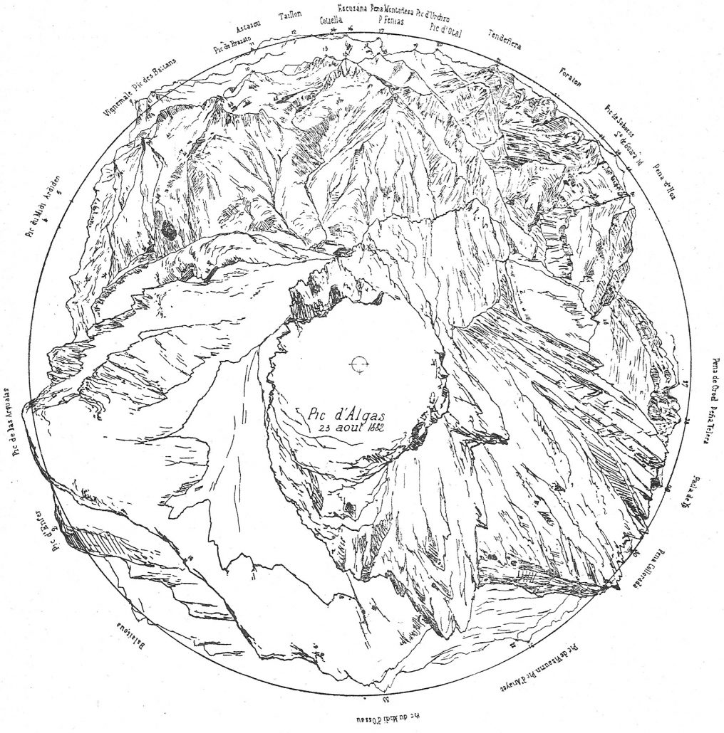 Ce mode de représentation a son histoire et ses appareils. En 1873, Franz Schrader inventera l’Orographe (figure I-39a) qui perpétua la représentation initiée par de Saussure et von der Linth en l’automatisant. En plus du tracé des montagnes alentour (figure I-39b), on relevait l’azimut et la hauteur des sommets figurés, données qui étaient utilisables pour la réalisation des cartes topographiques classiques. [96]