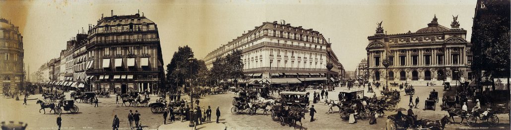 Figure II-4 Panorama de 150° au carrefour de l’opéra à Paris réalisé avec le Cylindrographe par Étienne Neurdein, 34 X 81/4″ (86.4 X 20.10cm)